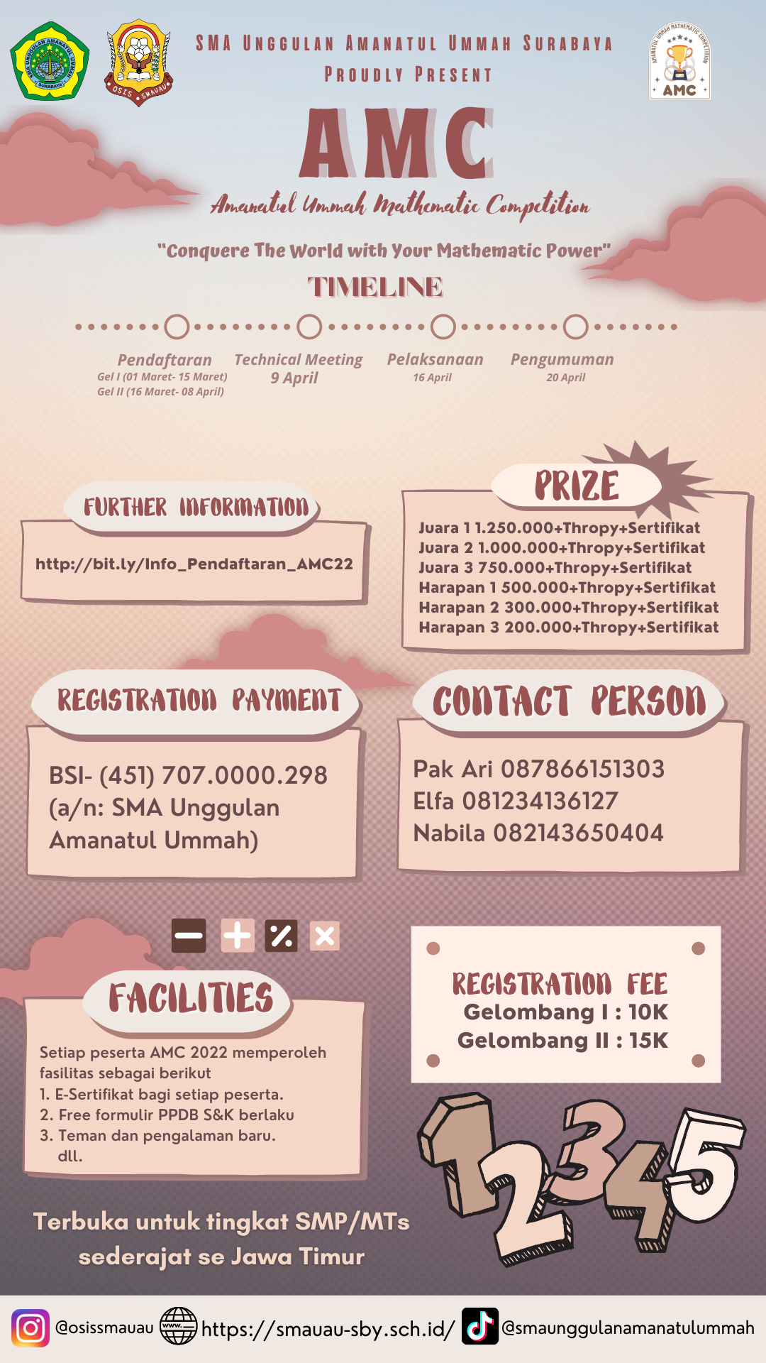 Hello guys, kabar gembira untuk kamu siswa SMP/MTs se – Jawa Timur. SMA Unggulan Amanatul Ummah Surabaya dengan bangga mempersembahkan kompetisi Matematika yang akan diselenggarakan secara online pada tanggal 16 April 2022.